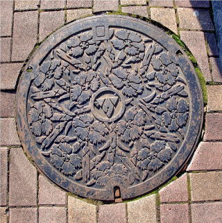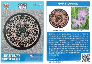 その 3 蓋全体に市の花;ナデシコ を幾何学的に 描き 中心に市章をその周りに4個 そして 更に周りに7個 計13個配したデザイン 撮影日; 20012年3月30日 撮影場所; 小田急小田原線「渋沢駅」駅前 提供者; 甥の Y・H さん