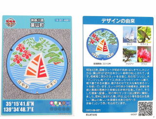 その 3 青い空と青い海に浮かぶヨット 町の花; ツツジ 町の木;クロマツ をそして真中に 町の鳥;ウグイス を描いたカラー版の デザイン 撮影日; 2019年12月25日 撮影場所; 葉山町 役場内 提供者;甥のH・Y さん