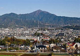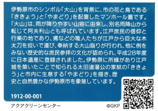 その 3 山岳信仰の山「大山」を背景に羽ばたく市の 鳥;ヤマドリ 下に市の花;キキョウ を描いた デザイン 撮影日; 2008年6月15日 撮影場所;小田急 「伊勢原駅」駅前 提供者; 甥の Y・H さん