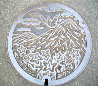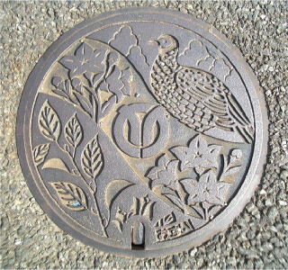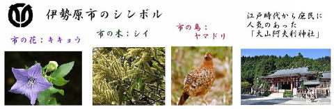 その 4 中心に市章を上に市の鳥;ヤマドリ 市の花; キキョウ そして市の木;シイ を描いたデザ イン 撮影日; 2008年6月15日 撮影場所;小田急 「伊勢原駅」駅前 提供者; 甥の Y・H さん