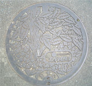 その 2 蓋全体に 町の木;シイガシ を下に町の 花;アジサイ を描き 右下に管理者名を ローマ字とひらがなで配したデザイン 撮影日;2009年1月5日 撮影場所;小田急 小田原線「開成駅」 駅前付近 提供者; 甥の Y・H さん