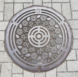 その 3 蓋全体に市の花;ノギク を描いたデザイン 中心の市章の様な紋様は不明です 撮影日; 2008年5月18日 撮影場所; 小田急江ノ島線「大和駅」 駅前付近 提供者;甥のH・Y さん