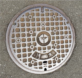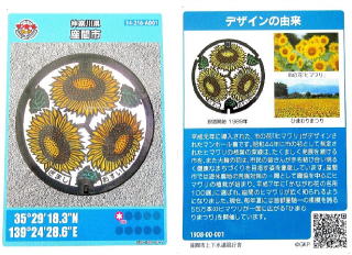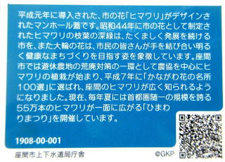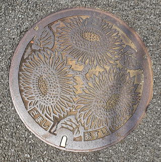 その 3 蓋全面に 市の花;ヒマワリ を3輪描いた デザイン 撮影日; 2019年8月18日 撮影場所; 小田急小田原線「座間駅」 駅前付近 提供者;甥のH・Y さん