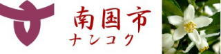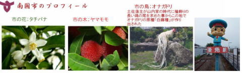 その 1 全体を三分割して 左上に 市の花;タチ バナ を右に日本の特別天然記念物に 指定されている 市の鳥;オナガドリ を そして右下に市の木;ヤマモモ を描いた デザイン 撮影日; 2006年5月21日 撮影場所; 南国市 下末松 K-45号沿い