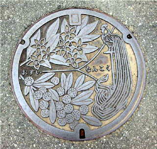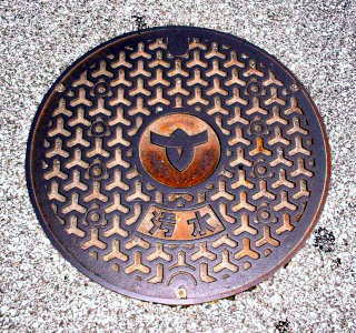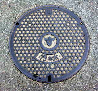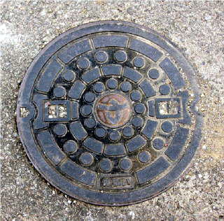 その 4 ● と 長方形の交互のリング状の背景 模様の中心に市章を 下に識別文字 「おすい」 を配したデザイン 一般家庭 と本管を繋ぐ蓋 撮影日; 2009年11月29日 撮影場所; 南国市 三畠 田園地帯の農家