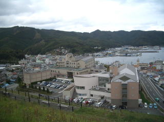 震災前の女川町の港と市役所の建物