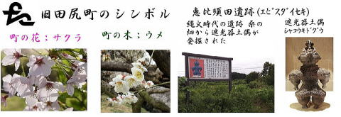 財)を中心に 周りに町の木;ウメ 町の花;