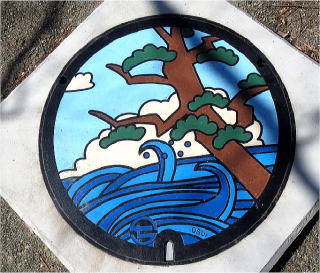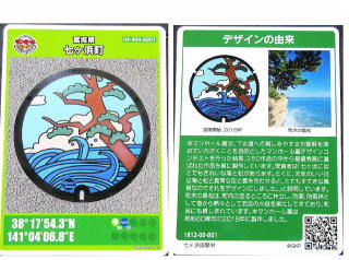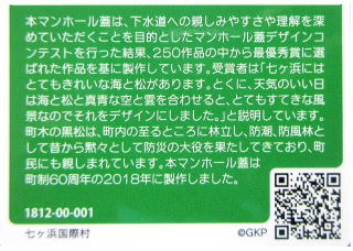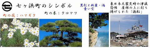 その 2 七ヶ浜には青い海と松が沢山あり デザインも 町の木;クロマツ と 青い海と白い雲 そして 青い空を描いたデザインのカラー版 撮影日; 2019年3月9日 撮影場所; 七ヶ浜国際村 提供者; 甥の Y・H さん