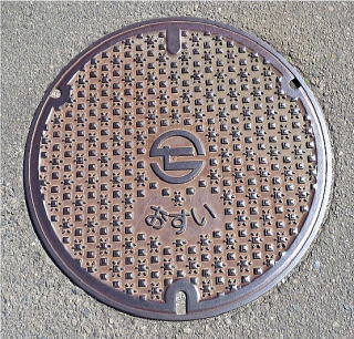 その 3 スリップ止のイボ状突起物の背景模様の 中心に町章と識別文字を配したデザイン 撮影日; 2019年3月9日 撮影場所; 七ヶ浜国際村 提供者; 甥の Y・H さん
