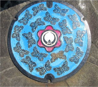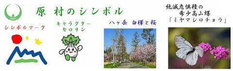 その 2 青色の背景色の中心に村章を周りに「ミヤマ シロチョウ」を配したデザイン 「ミヤマシロチョウ」は標高 1,400 ~ 2,000 m の南アルプス 八ヶ岳 浅間山系等に生息が 限定された貴重な蝶です 撮影日; 2018年8月3日 撮影場所; クリーンレイク諏訪 の 入口展示場所