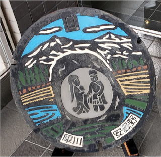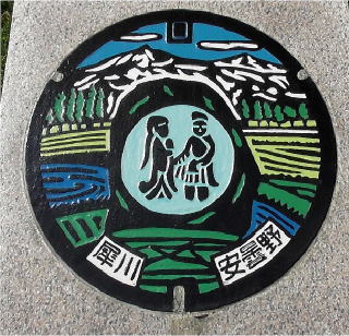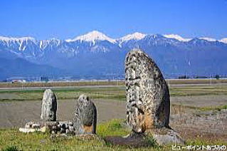 「道祖神」を中心に青空に浮かぶ「常念岳」