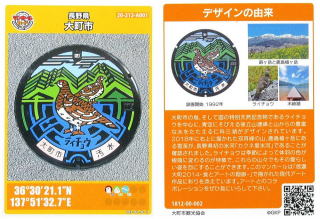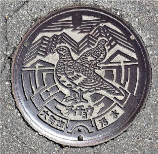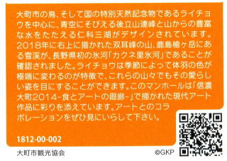 その 3 市の鳥;ライチョウ を2羽を中心に 後ろ 立山連峰の双耳峰の「鹿島槍ヶ岳」を背景 に手前に「仁科三湖」を描いたデザイン