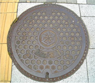 その 2 多数の六角形の背景模様の中心に 市章と識別文字を配したデザイン 撮影日; 2008年6月8日 撮影場所;長野電鉄 「須坂駅」 駅前付近 提供者; 甥のY・Hさん