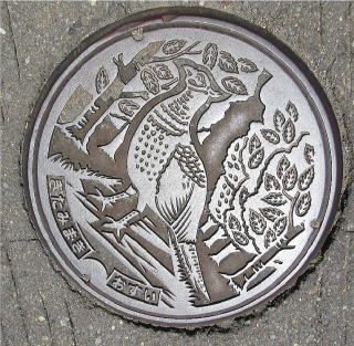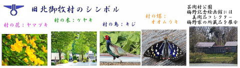 その 2 中心に村の鳥;キジ を両横に村の木; ケヤキ を描いたデザイン 撮影日; 2017年6月5日 撮影場所;しなの鉄道 「田中駅」 駅前付近 提供者;甥のY・Hさん