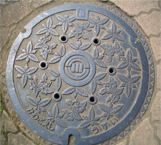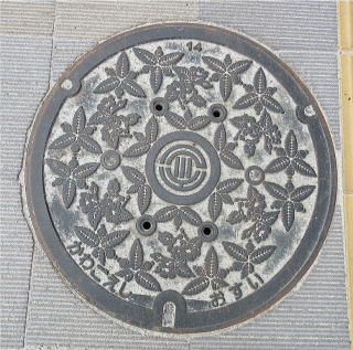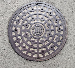 コンクリートの蓋の中心に市章を配したデ