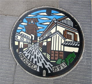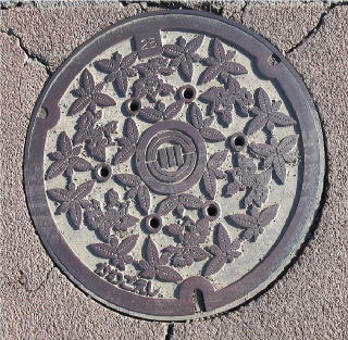 橙色の背景色に蓋を二分割する様に市章と