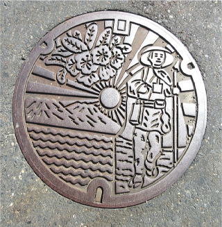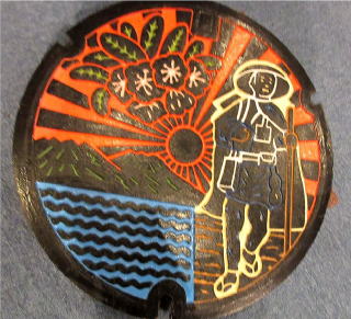 その 2 町の中央を流れる「日野川」 東に聳える 「錦向山」 町の花;シャクナゲ 事前豊か な日野盆地を朝日を背負って意気揚々 と歩く「日野近江商人」を描いたデザイン のカラー版 撮影日;2017年12月8日 撮影場所;淡海(オウミ)環境プラザ館内 提供者;妹夫婦 S・H さん