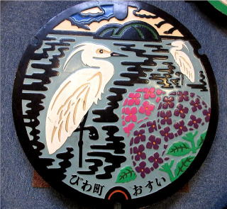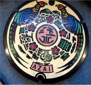 その 2 中心に「汚水」の字を抽象的に描き 周 りに町の木;ウメ の花を散りばめて自然 豊かな浅井の町を 更にその周りに町の 鳥;キジ を描いたデザインのカラー版 下にローマ字で管理者名「AZAI」を 配したもの 撮影日;2017年12月8日 撮影場所;淡海(オウミ)環境プラザ館内 提供者;妹夫婦 S・H さん |