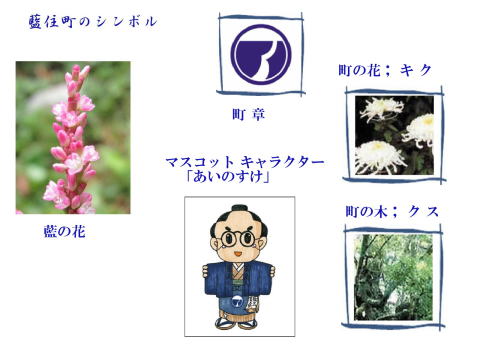 その 1 藍染の染料の元の植物の栽培が 盛んであった町で その名が今に 残っている 中心に藍の花を その周りに藍玉 (染料の前)を更にその周りに町の キャッチフレーズ「花と緑と太陽の 町」 下には五線譜の上を花がリズ ミカルに歌ってる様子を描いたデ ザイン 撮影日; 2007年12月 20日 撮影場所; 藍住町 奥野 |