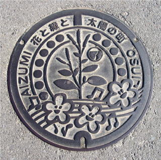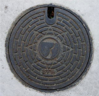 その 2 リング状模様の背景の中心に町章 を配したデザイン 一般家庭と本管 を繋ぐ鉄製の蓋 撮影撮影日; 2007年12月 20日 撮影場所; 藍住町 奥野日 |