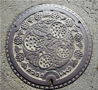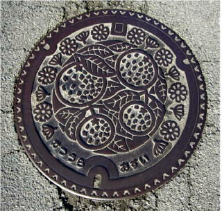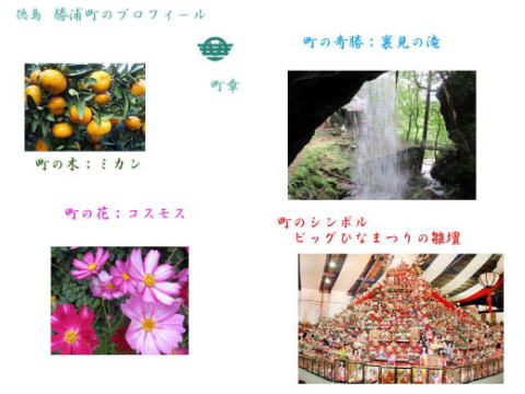 その 1 中心に町の特産物であるミカンを 周りに 町の花;コスモス と 町の木; ミカン の花を下に管理者名と識別 文字を配したデザイン 撮影日; 2008年2月4日 撮影場所; 勝浦町 横瀬 横瀬小学校前の県道16号沿い