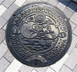 その 1 伝説 「阿波の狸合戦」 の主人公 「金長狸}」 の根城にしていたのが 小松島(日開野) で 有ったことから狸をモチーフにしたもの 中心に風船のように膨らんだ二匹の狸と市章 を そして管理者名 「こまつしま」 を配した デザイン 風船の二匹のタヌキが可愛いです 撮影日; 2007年2月21日 撮影場所; 小松島市 小松島町 徳島赤十字病院前の県道33号沿い