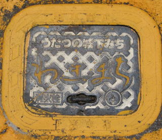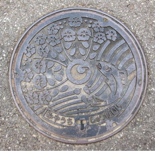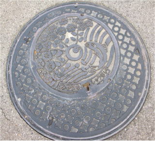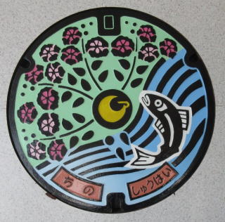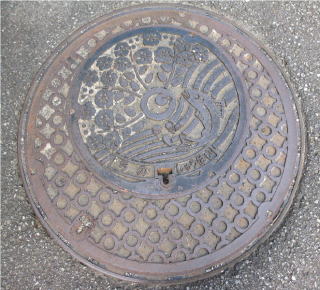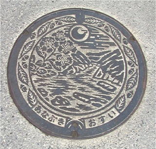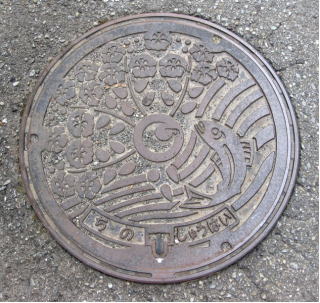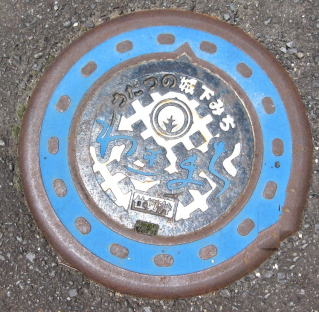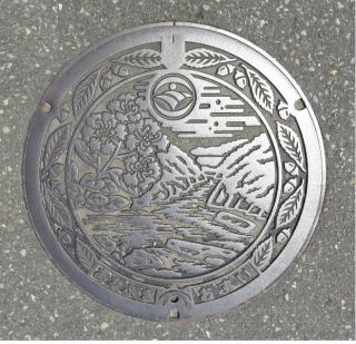 その 1 中心に四国一の清流誇る穴吹川の 景勝地「剣峡」と 町の花;サルスベリ と旧町章を 更にその周りに 町の木; カシ の葉と実を下に旧の管理者名と 識別文字を描いたデザインのカラー 版 撮影日; 2017年8月21日 撮影場所; 穴吹浄化センター内 |