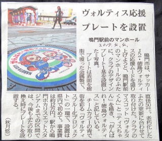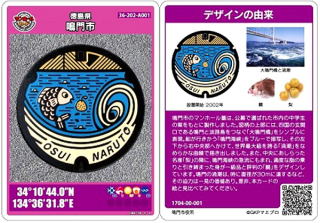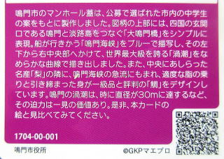 その 2 マンホールカードの元になったデザイン マンホール JR鳴門駅前にたった一枚しかなない貴重 なカラーマンホール 撮影日; 2017年4月14日 撮影場所; JR 鳴門駅前 (駅舎南側) |