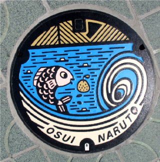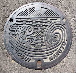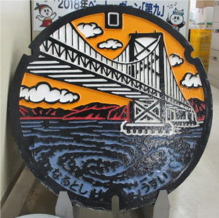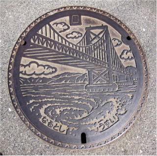 その 9 リアルに大鳴門橋と豪快に描かれた渦潮の デザイン 雨水専用のマンホール 撮影日; 2009年4月9日4 撮影場所; 撫養町斎田 うずしおふれあい 公園の西側道路 |