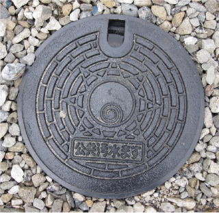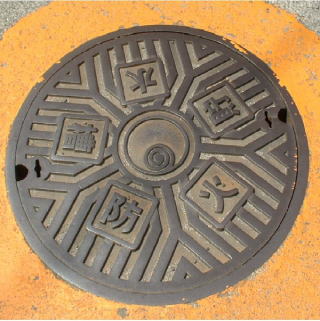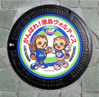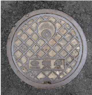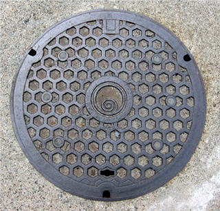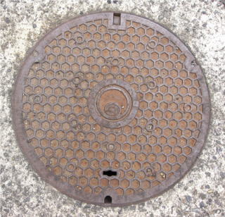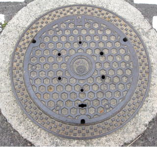 その 6 六角模様の背景に中心に市章を配した デザイン 一般家庭と本管を繋ぐマン ホール 撮影日; 2011年6月3日 撮影場所; 撫養町斎田 うずしおふれあい 公園付近 |