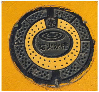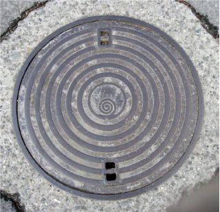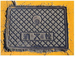 その 13 その 12 に良く似たデザイン 中心の模様が シンプル 一般家庭と本管を繋ぐ樹脂製の マンホール 撮影日; 2017年4月14日 撮影場所; 市役所下水道課前の道路 |