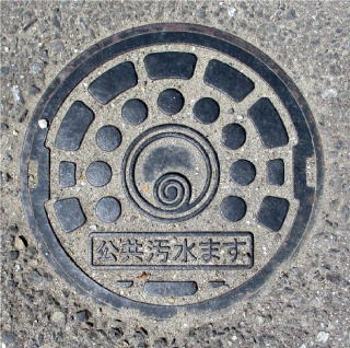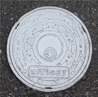 その 14 リング状模様の背景の中心に市章と識別 文字 (公共汚水ます) を配したデザイン 一般家庭と本管を繋ぐ鉄製マンホール 撮影日; 2017年4月14日 撮影場所; 市役所下水道課前の道路 |