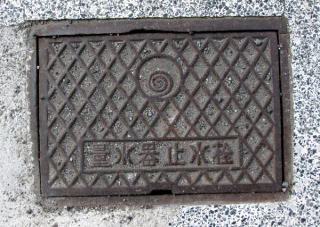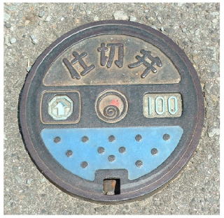 その 22 市章と識別文字を配した家庭用の水道 量水器と水道止め弁の蓋 撮影日; 2005年8月7日 撮影場所; 鳴門高校前の道路; |