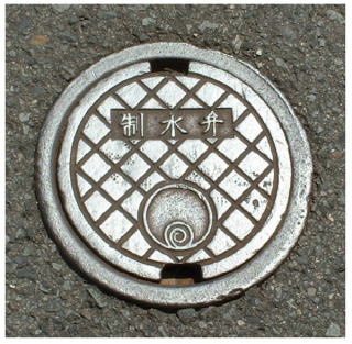 その 21 識別文字と市章を配した水道弁 一般家庭用の水圧調整弁蓋 撮影日; 2005年8月7日 撮影場所; 鳴門高校前の道路 |