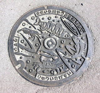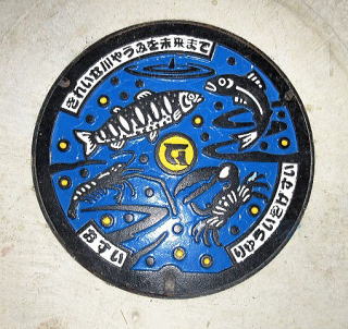 その1 中心に徳島県の県章を上にキャッチ フレーズ周りに清水に住む魚 カニ エビ を描き下に識別文字を配した デザイン 撮影日; 2005年8月7日 撮影場所; 鳴門市銀天街西詰