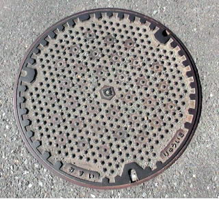 その 2 滑り止めのイボ状突起物の背景模様 の中心に県章を下に識別文字を配し たデザイン 撮影日; 2015年3月28日 撮影場所; JR板野駅東 県道12号 165号交差点