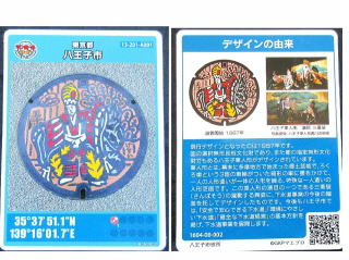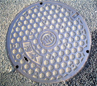 その 2 数多くの六角形の背景模様の中心に市章 と識別文字「汚水」を配したデザイン 撮影日; 2008年6月14日 撮影場所; JR中央線 八王子駅前 南口付近 提供者; 甥のY・H さん