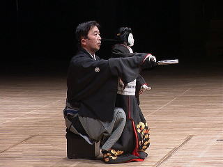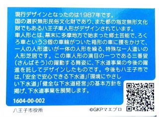 その 1 都の無形文化財に指定されている 江戸末 期から八王子に伝わる「車人形」と言う 人形劇の 「三番叟(サンバソウ)」を踊る人 形を描いたデザイン 八王子の「車人形」は文楽の三人遣を 「ろくろ車」と呼ばれる車を収めった箱に 腰かけて人形を一人遣いで操る 撮影日; 2008年6月14日 撮影場所; JR中央線 八王子駅前 南口付近 提供者; 甥のY・H さん