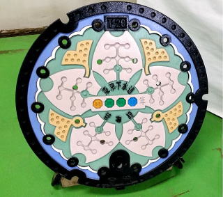 東京都 (23区) 中心に都の花;ソメイヨシノを 花の間に 都の 木;イチョウ の葉をその二つを取り巻くよう に 都の鳥;ユリカモメ を描いたデザイン そして中央に4つに色分けした数字やアル ファベットは蓋を管理する記号 |