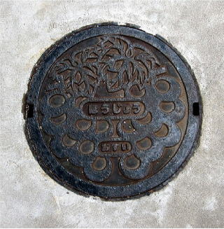 その 1 蓋全体に特産品 「ブドウ」 の房と葉が付いた デザイン 中心に管理者名 「ほうじょう」 と平 仮名で書かれたデザインも珍しい