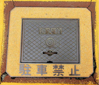 その 6 ひし形の背景模様の中心に市章を配した 消火栓蓋 撮影日; 2016年4月4日 撮影場所; 湯田温泉街の一般の道路