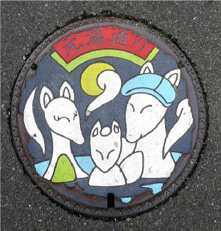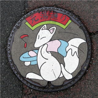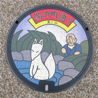白狐が湯桶を手にタオルを肩にかけ鼻