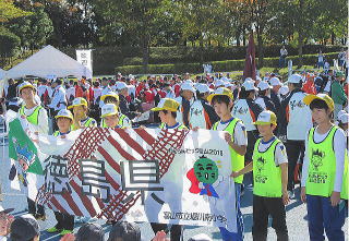 | 小学生達からプレゼントされた 横断幕を手に持ち行進 |