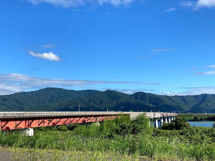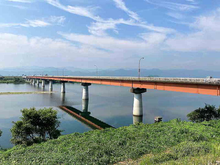 右岸上流側より スレンダーな赤い鋼桁橋