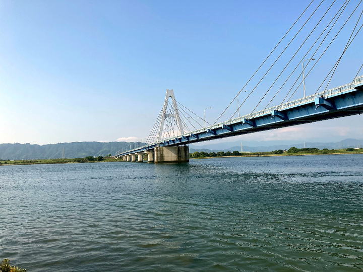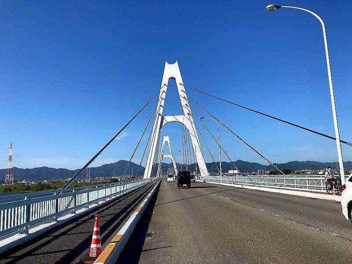 の純白の A 型タワーが青い空にひときわ目立つ「斜張橋」