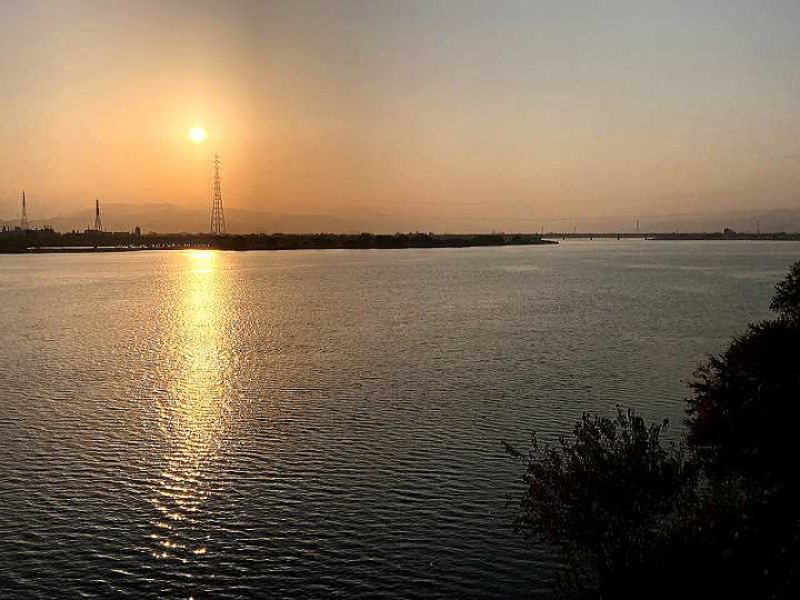 右岸上流の山に傾く夕日
