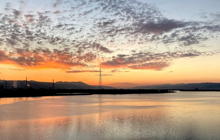 右岸上流の山と茜に染まる雲