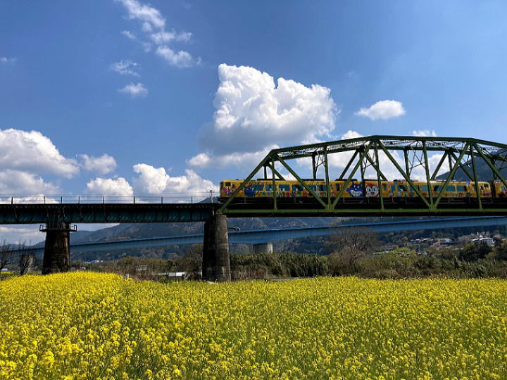 土讃線橋りょう越しに望む 菜の花と列車のタイミングがグー 左岸上流側より