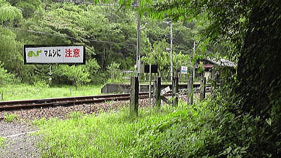 かっては乗降客が駅前の方(西)の斜面を登って通って いましたが 今ではその気配は全くなし マムシ注意の 看板がそれを物語っていました |