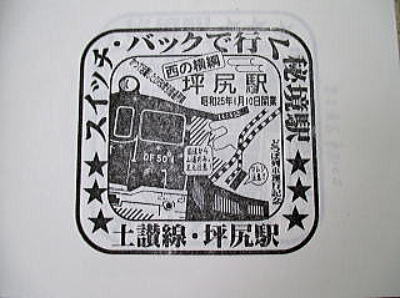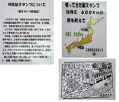| 主だった駅には「駅スタンプ」がある ここ坪尻駅にも 備えられていたが ある日忽然と無くなってしまった その後 1,300 kmも離れた青森県の中沢駅で 発見され無事に帰って来た そのスタンプが説明付きで 置かれていた |